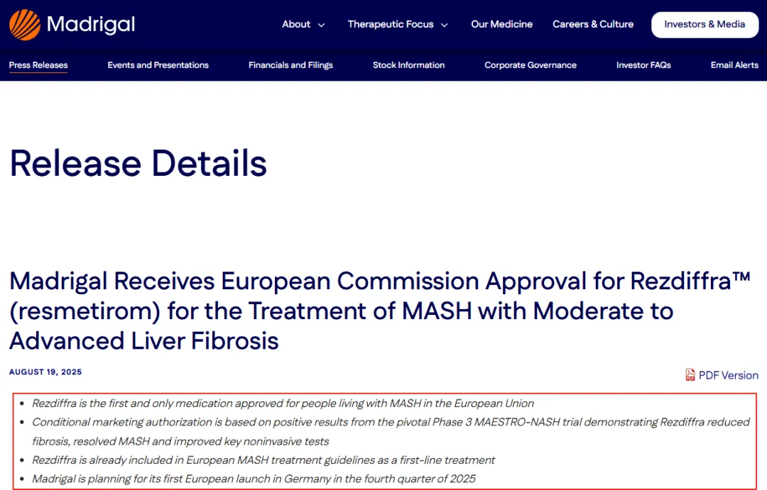 2025年8月19日,歐盟委員會正式批準Rezdiffra?(Resmetirom)上市,用于治療伴有中度至進展期纖維化的代謝相關(guān)脂肪性肝炎(MASH)患者。Rezdiffra?成為歐盟該疾病領(lǐng)域首個且目前唯一獲批的藥物,并且已被納入歐洲MASH治療指南。